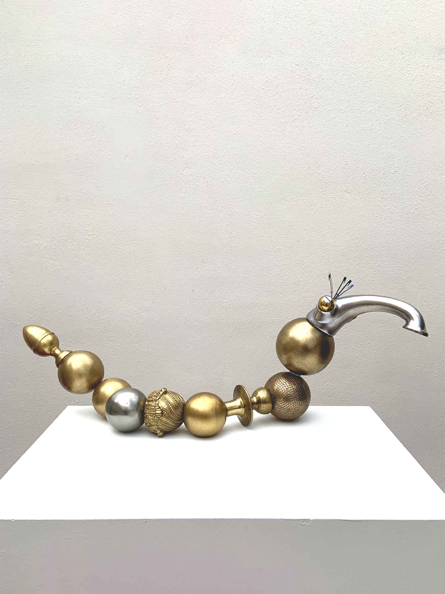 És una escultura que dóna nova vida a objectes quotidians com aixetes, poms de porta i fragments de làmpades. Amb formes sinuoses i una paleta daurada, l’obra evoca una criatura imaginària que combina elements orgànics i mecànics. Cada peça reciclada adquireix un significat nou, simbolitzant la transformació i el renaixement.